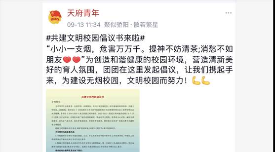 学期初,学校学生会就共建“无烟校园”向全校师生发出倡议。“小小一支烟,危害万万千”,无烟校园是文明校园、和谐校园、健康校园的重要表现。倡议书发布以来,得到了学校师生的积极响应。各二级学院学生会积极配合,一同商讨并划分了“包干”区域。2020级的杨西寅同学说:“看到倡议书后我马上就去报名参加校园文明纠察队的志愿服务活动,我想为无烟校园的建设贡献一份自己的力量。”