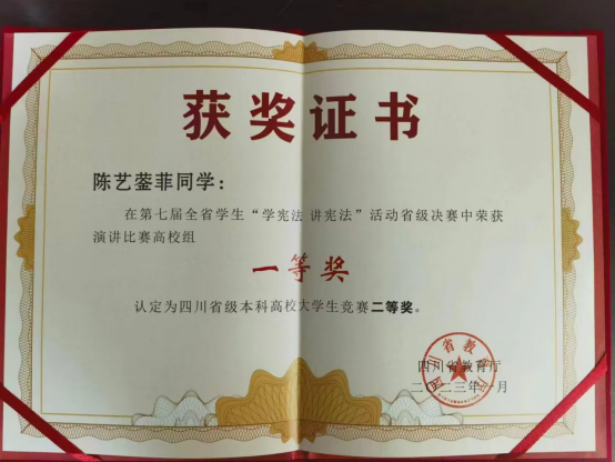 为深入学习贯彻习近平法治思想,纪念现行宪法公布施行四十周年,进一步弘扬宪法精神,夯实思想基础,筑牢宪法信仰,树立宪法权威,培养增强青少年法治意识与宪法知识,西南财经大学天府学院学子积极参与由四川省教育厅主办的第七届学生“学宪法,讲宪法”演讲比赛 。在19所高校参赛选手的激烈的竞赛中,学校2021级学子陈艺蓥菲凭借对宪法知识的充分了解和良好的现场表现,获得了此次演讲比赛高校组的一等奖,认定为四川省级本科高校大学生竞赛二等奖。